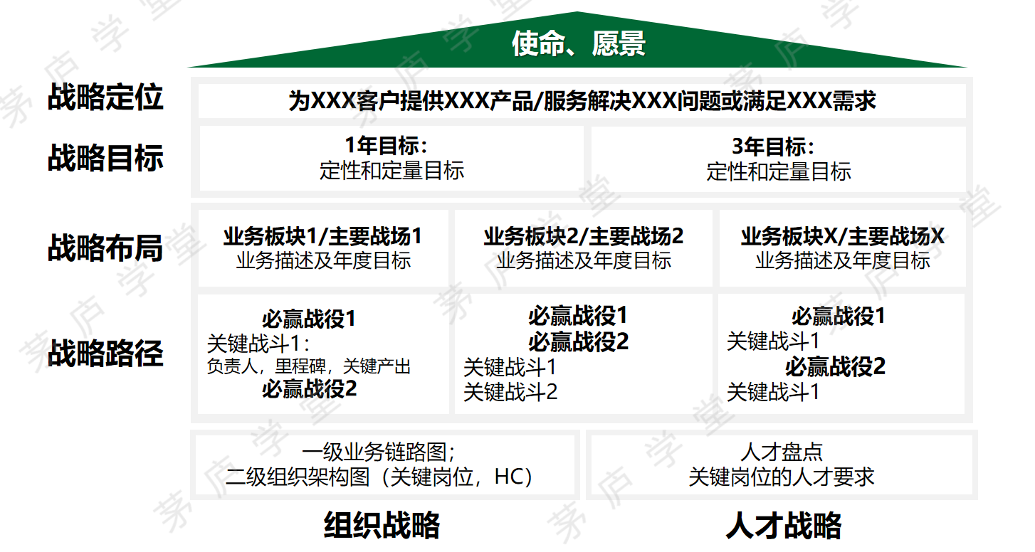 战略定位明确后,一般业务战略的制定有三个关键要素:战略目标、战略布局、战略路径。 当所有关键要素共识清楚之后,我们通常会用战略屋的形式进行一张图的呈现。